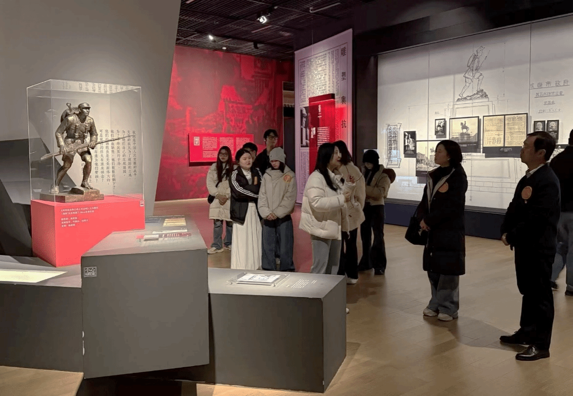 展厅内,党员们驻足品鉴《无名英雄像》(复制稿)、张漾兮木刻等作品、水雾投影等互动设计让历史更鲜活。大家在交流中深悟先辈信念与斗志,读懂“艺术为抗战”的深刻内涵。
