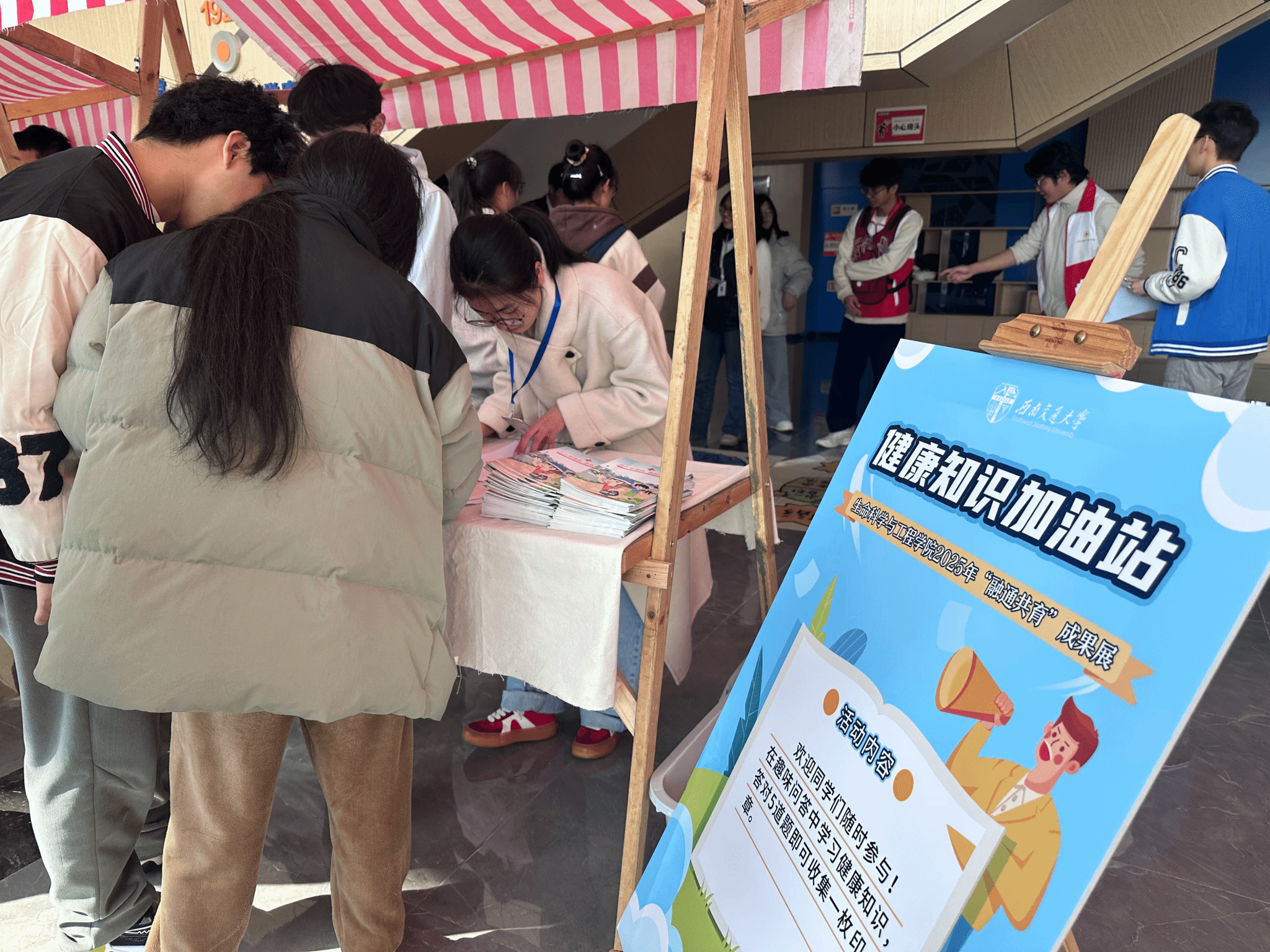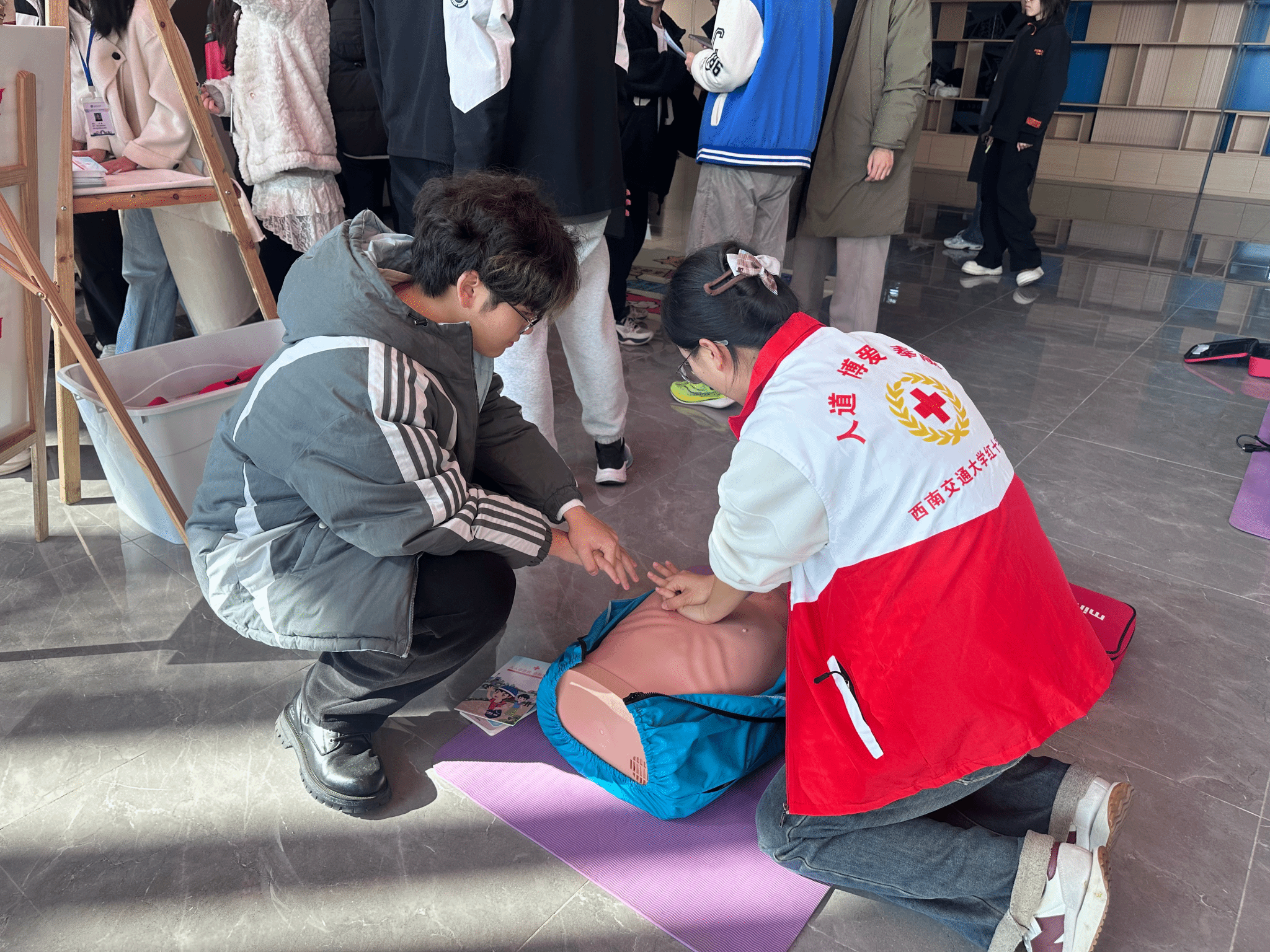 “融通共育”成果展现场专门设立“健康知识加油站”互动环节,同学们不仅通过趣味问答巩固了理论学习,更在校红十字会志愿者的指导下进行了“一对一”的急救技能实操。志愿者借助模拟人教具,对同学们的按压位置、深度、频率及手法进行了细致教学与个性化指导,有效帮助大家跨越了从“知道”到“做到”的壁垒。