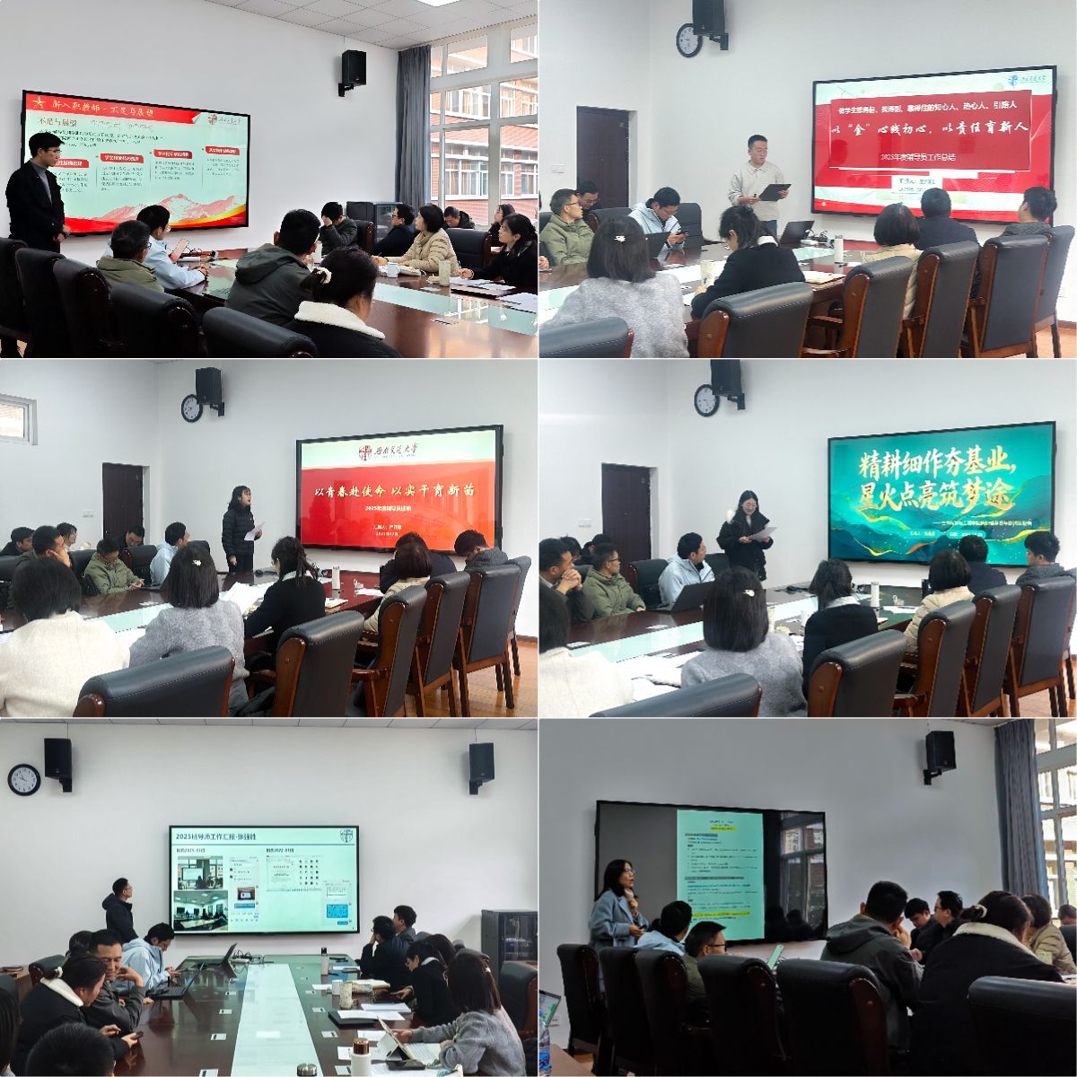 在工作述职环节,辅导员与班导师两支队伍协同联动,共同诠释“融通共育”的生动实践。7位辅导员老师立足立德树人根本任务,围绕辅导员九大工作职责,从学生日常管理、专项工作成效、个人工作亮点与未来规划等方面进行了系统汇报,全面展示了一年以来的工作成效。18位班导师则从专业教师视角,聚焦“学业指导、无码直播
